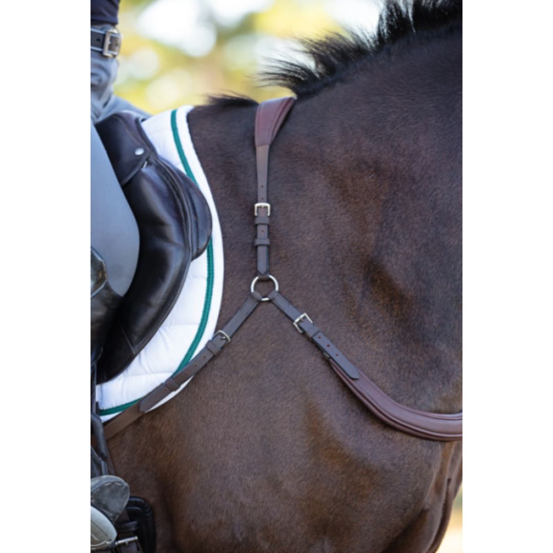 It attaches to the billets at an angle that frees the horse’s shoulder and doesn’t restrict movement. A soft but thick chest piece folds around the horse’s chest and keeps the saddle in place.