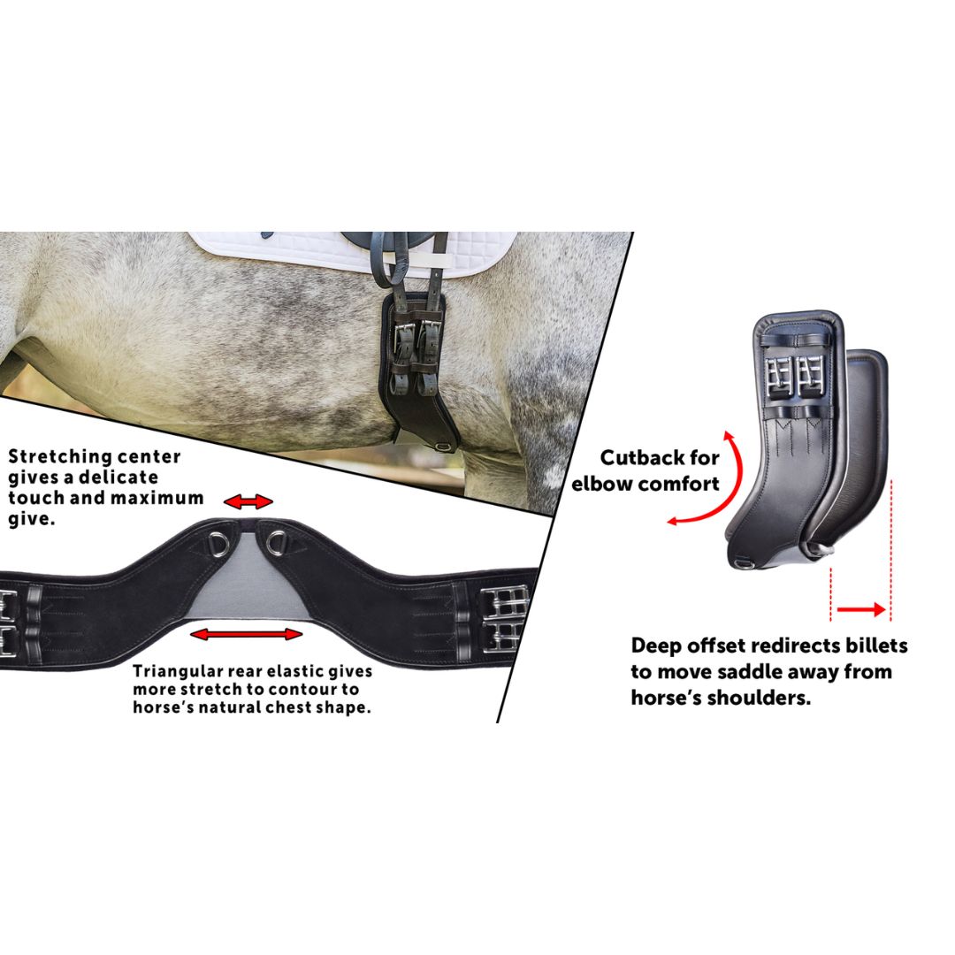 The StretchTec Shoulder Relief Girth™ by Total Saddle Fit brings the next level of intuition to functional girths. It is hands downs the most technologically advanced girth available. Not only does the StretchTec Shoulder Relief Girth™ provide the same shoulder freedom and elbow comfort as its predecessor, but it has a one-of-a-kind patented (US Patent No. D843,666) triangular centre elastic feature for additional performance. The triangular centre elastic allows the StretchTec Shoulder Relief Girth™ to expand with the 1.5cm chest expansion that horses experience while breathing. Its design also allows it to stretch in a more anatomically friendly way to contour better to a horse’s barrel and provide even contact through the sternum area.